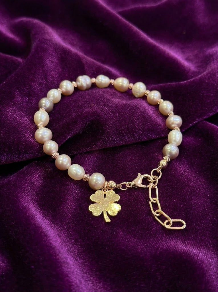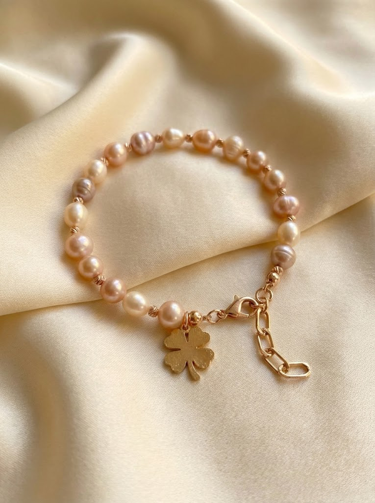 Şansı bileğinizde taşımanın en zarif yolu. Doğanın sunduğu en tatlı pembe, somon ve krem tonlarındaki inciler, iyi dileklerin evrensel sembolü olan dört yapraklı yonca ile bu tasarımda buluştu. Umudun ve uğurun simgesi olan bu zarif bileklik, hem kendiniz için şık bir tılsım hem de sevdiklerinize verebileceğiniz en anlamlı hediye olacak.
